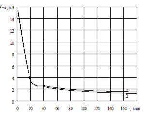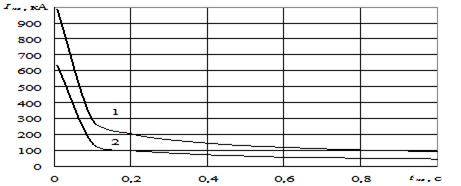 Рис. 22. Зависимость тока короткого замыкания от времени срабатывания защиты: 1 – короткое замыкание без предшествующей нагрузки; 2 – с предшествующей нагрузкой