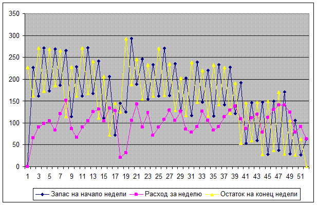 Видим, что в 48-мую неделю и в 50 остаток на складе менее 0, т.е. количества материалов не хватит для бесперебойной работы.
