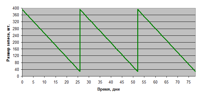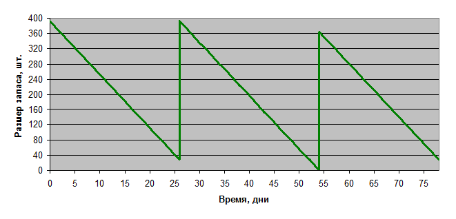При размере партии в 364 единицы узлов, при интервале времени между заказами в 26 дней, при времени поставки в 2 дня, с гарантийным запасом в 28 штук и единичным сбоем поставок в 2 дня, график выглядит следующим образом: