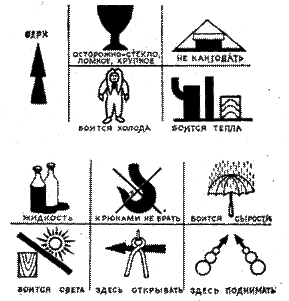 В специальной маркировке делаются специальные указания по обращению с грузом в пути и при погрузочно-разгрузочных операциях („Верх", „Не кантовать", „Боится сырости" и т. д.). Специальная маркировка иногда обозначается условными знаками или рисунками.