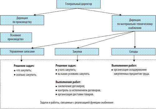 На рис. 1 представлен вариант организационной структуры предприятия с распределением перечисленных выше задач между различными функциональными подразделениями. Как видим, задачи «что закупить» и «сколько закупить» решаются дирекцией по производству. Здесь же выполняются и работы по складированию закупленных предметов труда.
