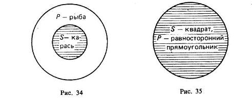 Распределенность терминов в суждениях можно иллюстрировать с помощью круговых схем Эйлера. На рис. 34 изображено соотношение S