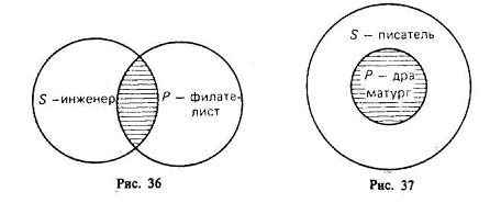 изображено на рис. 36. Субъект не распределен, так как в нем мыслится только часть инженеров, т. е. объем субъекта лишь частично включается в объем предиката. Предикат тоже не распределен, так как он также лишь частично включен в объем субъекта (только некоторые филателисты являются инженерами).