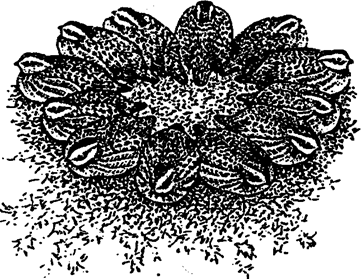 Существует постоянная сигнализация, звуковая и зрительная связь между особями в стаях оседлых птиц, которая используется для обнаружения благоприятных мест ночевок и отдыха, источников корма, восходящих потоков воздуха и т. д. Так, подобно пионерам Дикого Запада в вестернах, виргинские перепелки образуют на ночь кольцо «спина к спине» (рис. 10.5). Такая привычка не только помогает им уберечься от хищников, но и согревает холодными осенними и зимними ночами. Вспугнутые перепелки врассыпную взлетают в разные стороны.