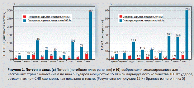 Как показывает рисунок 1, война между Индией и Пакистаном, в которой каждая из сторон использует боезаряды суммарно в 0.75 мегатонн, привела бы к гибели около 44 миллионов и выбросу около 6.6 триллионов граммов (Tg) сажи.