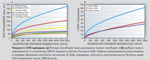 Рисунок 2 иллюстрирует, как количество потерпевших и погибших, а также количество выброшенной сажи повышаются в Китае, России и США вместе с увеличением числа взрывов мощностью 100 Кт. При построении рисунка мы предполагали, что нацеливание по регионам производится в порядке убывания плотности населения в радиусе 5,25 км от эпицентра. Бомбардировки Китая имели бы самые тяжелые последствия, поскольку в этой стране есть много густонаселенных городских центров.