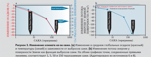 Изменения температуры, представленные на рис.3а, будут оказывать большое воздействие на сельское хозяйство в средних и высоких широтах. Изменение режима осадков, с другой стороны, будет иметь наибольшее влияние в тропиках. Даже 5Tg выбросов сажи привело бы к 40% сокращению осадков в Азиатском регионе муссонов. Южная Америка и Африка увидели бы уменьшение количества осадков в результате конвекции в восходящих потоках циркуляции Хэдли, являющейся основной глобальной меридиональной ветровой системой, связывающей тропики и субтропики. Изменения в динамике циркуляции Хэдли могут вообще повлиять на климат в глобальном масштабе.Дополнением к изменению температуры является воздействие радиации, изменение потока энергии. Рисунок 3b показывает, как ядерная сажа изменяет воздействие солнечной радиации на поверхность Земли, и сравнивает эти эффекты с двумя хорошо известными явлениями: с потеплением, связанным с парниковыми газами, и извержением вулкана Пинатубо в 1991 году, крупнейшим в XX веке. Со времени промышленной революции парниковые газы привели к увеличению потока энергии на 2,5 Вт/м2.