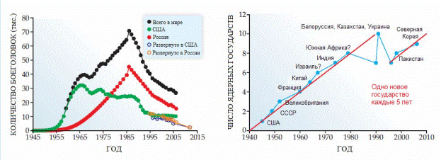 На приведенных ниже графиках показано изменение запасов ядерного оружия в мире и числа ядерных держав. Израиль и Южная Африка не проводили ядерных испытаний, так что даты,когда они стали ядерными государствами, точно не определены. Южная Африка, Белоруссия, Казахстан и Украина отказались от своих ядерных арсеналов. Хотя общее количество мировых запасов ядерных боеголовок сократилось с 1986 года почти в три раза, примерно 26 000 боеголовок еще существовало на 2006 год и более чем 11 000 боеголовок было развернуто. Значительная часть боеголовок в мире находятся на складах, в резерве или в процессе демонтажа. Великобритания и Китай в настоящее время имеют примерно по 200 единиц ядерного оружия, а Франция около 350. Ядерный арсенал Израиля, скорее всего, насчитывает более 100 единиц. Индия и Пакистан, в общей сложности, вероятно, располагают более чем 100 зарядами. Мощности боеголовок трудно определить, но они, скорее всего, находятся в диапазоне от килотонны до десятков килотонн для Индии и Пакистана, и от 100 килотонн до нескольких мегатонн для других ядерных государств.