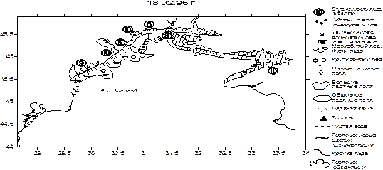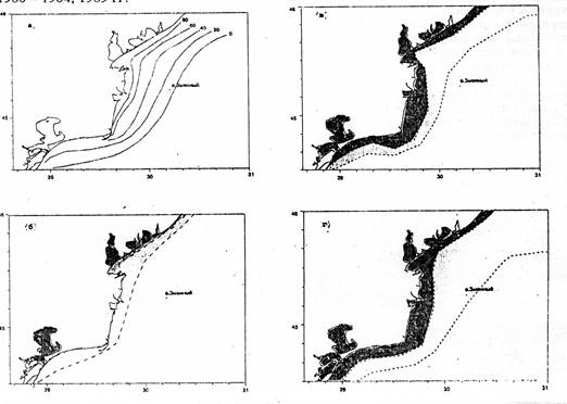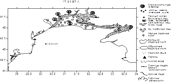 Рис. 2. Распределение льда в северо-западной части Черного моря в 1996, 1997 и 2008 гг.