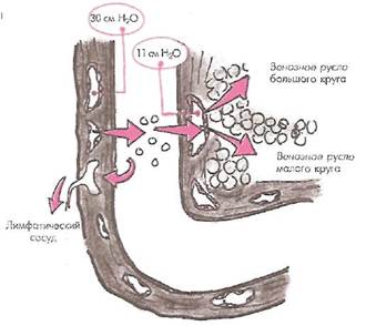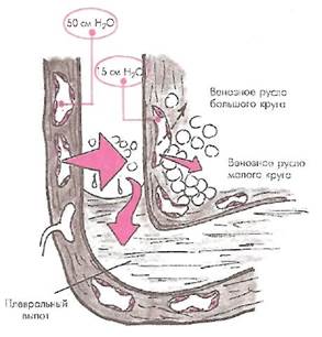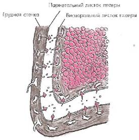 Следует также иметь в виду, что часть макромолекул воды, мелкодисперсных белков, солей, липидов и т.п. удаляется из плевральной полости по лимфатическим сосудам, которые особенно обильно представлены в париетальной плевре. Правда, скорость реабсорбции плевральной жидкости по лимфатическим сосудам примерно в 4-5 раз ниже (около 20 мл/ч), чем скорость транскапиллярного обмена.