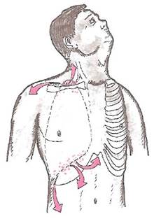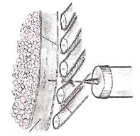 Установку дренажной трубки осуществляют под местной анестезией и под контролем рентгеноскопии или ультразвукового исследования. В VI межреберье по передней подмышечной линии делают разрез на коже. После дополнительной анестезии более глубоко расположенных тканей и париетальной плевры тонзиллярным зажимом создают канал в мягких тканях, через который осторожно вводят в плевральную полость проксимальный конец дренажной трубки, направляя ее кзади и вверх — к верхушке легкого (рис. 39). При этом дистальный конец трубки пережимают зажимом. После этого дренажную трубку фиксируют к коже двумя швами и присоединяют к вакуум-насосу. Последний обеспечивает сбор плеврального содержимого и поддержание отрицательного внутриплеврального давления (около 50-100 см вод. ст.).