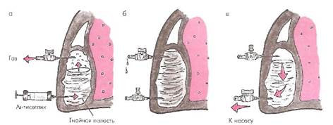 (рис. 40). Под контролем рентгеноскопического или ультразвукового исследования пунктируют плевру у дна полости, а второй иглой — в верхнем ее отделе. Через нижнюю иглу полость постепенно заполняют антисептическим раствором. При этом воздух, если он присутствовал в полости, удаляется через верхнюю иглу, а антисептический раствор хорошо контактирует со стенками полости. После этого закрывают краник верхней иглы, а через нижнюю аспирируют жидкость. Процедуру повторяют несколько раз, причем для промывания полости используют около 4-5 л антисептического раствора.