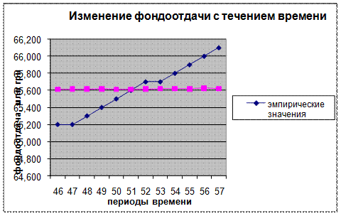 Как следует из графика эмпирической регрессии, фондоотдача изучаемого предприятия постоянно возрастает на протяжении всего временного периода, практически стабильно, лишь в некоторые периоды времени уровни фондоотдачи оставались неизменными. Это обстоятельство необходимо учитывать при разработке прогнозных показателей деятельности предприятия.