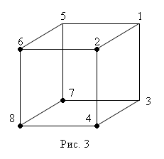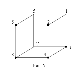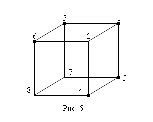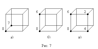 Отметим на модели куба элементарные конъюнкции: первой конъюнкции соответствует вершина 6, второй – вершина 5, третьей – вершина 8, четвертой – вершина 2 (рис 8). Таким образом, множество Nf