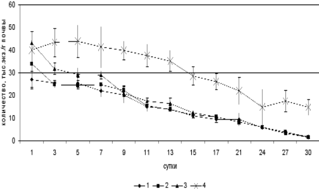 Рис. 1 - Изменение численности раковинных амеб в загрязненной незагрязненной почве: 1 - при концентрации нефти 10 мг/кг почвы; 2 - 20 мг/кг; 3 - 30 мг/кг; 4 - контроль При нефтезагрязнении почвы нефтью концентрацией 10 мг/кг происходит постепенное снижение численности раковинных амеб до 1,5 тыс. экз./г на 30-е сутки, что значительно меньше по сравнению с незагрязненной почвой - 14 тыс. экз./г. При загрязнении 20 и 30 мг/кг наблюдается значительное уменьшение численности на 3-и сутки на 10-12 тыс. экз./г, после чего происходит снижение численности до 1,6-1,8 тыс. экз./г на 30-е сутки. Снижение численности может быть обусловлено влиянием нефти на организм раковинных амеб.