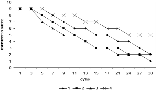 . Изменение видового разнообразия раковинных амеб исследовалось в загрязненной нефтью почве при концентрациях 10, 20, 30 мг/кг и в незагрязненной почве (рис. 2). Анализ данных, представленных на рис. 2, позволяет заметить снижение общего видового разнообразия в течение наблюдаемого периода. В контроле на 5-е сутки видовое разнообразие фиксировалось на уровне 9 видов, на 7-е сутки произошло снижение числа видов до 8, на 11–24-е сутки отмечено постепенное снижение видового разнообразия до 5 видов и стаби лизация на 24–30-е сутки на уровне 5 видов. При загрязнении почвы нефтью 10 мг/кг на 3-и сутки отмечалось 9 видов, затем наблюдалось значительное снижение видового разнообразияb- до 2 видов. При загрязнении почвы нефтью 20 мг/кг с 3-х до 15-х суток произошло постепенное снижение числа видов до 3, на 21-е сутки видовое разнообразие фиксировалось на уровне 3 видов, на 24-е сутки отмечено снижение и стабилизация на уровне 2 видов. При загрязнении почвы нефтью 30 мг/кг с 3-х до 21-х суток произошло значительное снижение видового разнообразия - до 2 видов, на 30-е сутки сохранился 1 вид. Таким образом, в загрязненной (при концентрациях 10, 20, 30 мг/кг) и незагрязненной почве в течение наблюдаемого периода произошло снижение видового разнообразия. Так, в загрязненной почве при концентрации 10 и 20 мг/кг в конце эксперимента преобладали раковинные амебы родов Euglypha
