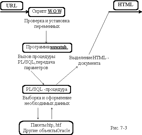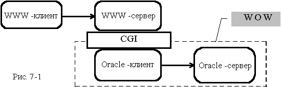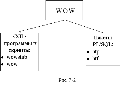 Структурно, WOW состоит из ряда исполняемых программ, соответствующих спецификации CGI и набора пакетов PL/SQL (см. рис. 7-2).