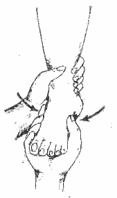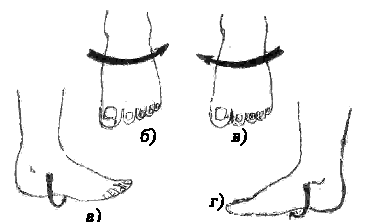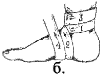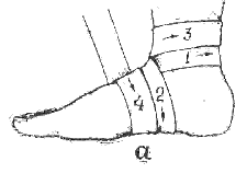 В случаях повреждения связок дистального межберцового сочленения должна накладываться тугая повязка на область лодыжек в положении сгибания стопы в голеностопном суставе (рис. 4.б). Поскольку мягкая повязка часто ослабевает, необходимо обучать правильным приемам бинтования самих пострадавших.