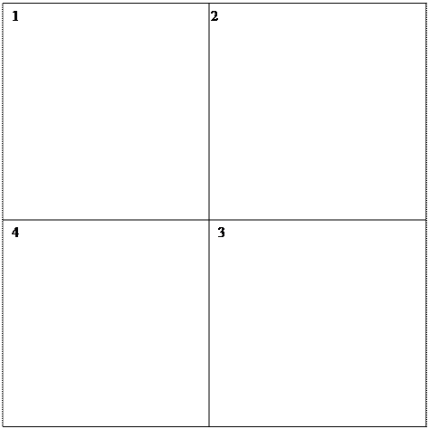 Для проведения теста раздаются заранее приготовленные бланки с нанесенными на них квадратами (смотри приложение рис.2) сторона квадрата 14 см. Этот квадрат делится на 4 малых со сторонами 7 см. Квадраты нумеруются следующим образом: рядом с квадратом 1 справа квадрат 2,под 2 квадратом-3, под первым-4. По команде «начали» вы должны в первом квадрате ставить точки, по команде «переход» ставить точки в каждом следующем квадрате, по команде «стоп» закончить работу. Время работы в каждом квадрате 5 секунд. Общее время 20 секунд.