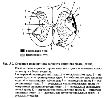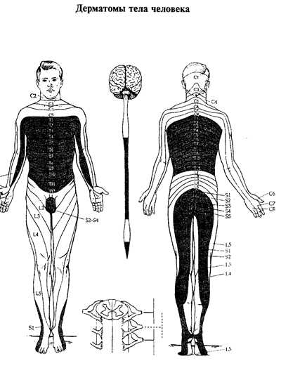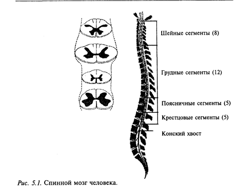 человека состоит более чем из трех десятков сегментов и заключен в позвоночник. Каждому сегменту примерно соответствует позвонок. Основная функция спинного мозга - передача к частям тела сигналов от вышележащих отделов центральной нервной системы, а также направление сигналов от соответствующих частей тела к вышележащим отделам мозга. Спинной мозг способен также к довольно сложной самостоятельной деятельности. На уровне спинного мозга осуществляются весьма сложные вегетативные рефлексы, определяющие мочеиспускание, дефекацию, потоотделение, покраснение кожи и многие другие. На уровне отдельных сегментов спинного мозга могут осуществляться рефлексы, участвующие в управлении движениями, например коленный, ахиллов и др. Спинной мозг дает начало вегетативной нервной автономной системе, деятельность которой весьма важна для защиты организма от неблагоприятных воздействий - холода, перегрева, кровопотери и т.п.