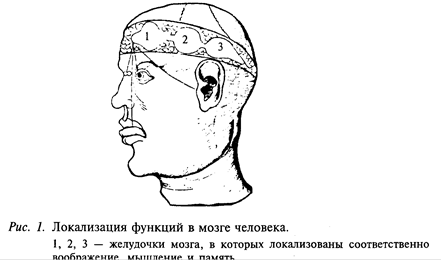 Как уже указывалось, психология как наука намного старше, чем физиология, и на протяжении многих веков психологи в своих исследованиях обходились без знаний физиологии. Конечно, это связано прежде всего с тем, что знания, которыми располагала физиология 50-100 лет тому назад, касались только процессов функционирования органов нашего тела (почек, сердца, желудка и др.), но не головного мозга. Представления ученых древности о функционировании головного мозга ограничивались только внешними наблюдениями: они считали, что в головном мозге - три желудочка, и в каждый из них древние врачи «помещали» одну из психических функций (рис. 1).