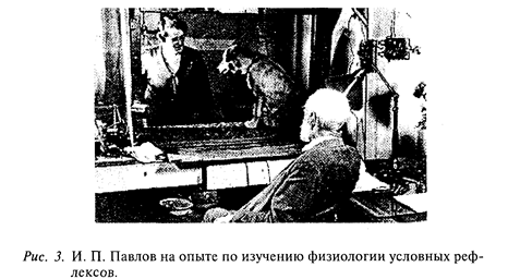 Ему принадлежит заслуга в создании метода экспериментального исследования «высшего этажа» головного мозга коры - больших полушарий. Этот метод назван «методом условных рефлексов». Он установил фундаментальную закономерность предъявление животному (И. П. Павлов проводил исследования на собаках, но это верно и для человека) двух стимулов - вначале условного (например, звук зуммера), а затем безусловного (например, подкармливание собаки кусочками мяса). После некоторого числа сочетаний это приводит к тому, что при действии только звука зуммера (условного сигнала) у собаки развивается пищевая реакция (выделяется слюна, собака облизывается, скулит, смотрит в сторону миски), т. е. образовался пищевой условный рефлекс (рис. 3). Собственно этот прием при дрессировке был давно известен, но И. П. Павлов сделал его мощным инструментом научного исследования функций головного мозга.