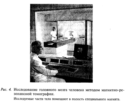 Методы исследования головного мозга человека постоянно совершенствуются. Так, современные методы томографии позволяют увидеть строение головного мозга человека, не повреждая его. На рис. 4 показан принцип одного из таких исследований - методом магнитно-резонансной томографии.