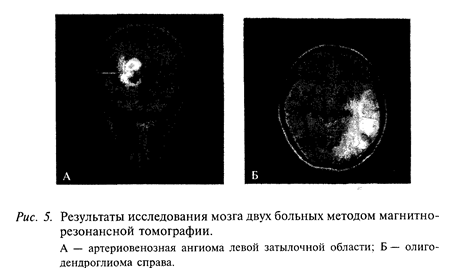 Головной мозг облучают электромагнитным полем, применяя для этого специальный магнит. Под действием магнитного поля диполи жидкостей мозга (например, молекулы воды) принимают его направление. После снятия внешнего магнитного поля диполи возвращаются в исходное состояние, при этом возникает магнитный сигнал, который улавливается специальными датчиками. Затем это эхо обрабатывается с помощью мощного компьютера и методами компьютерной графики отображается на экране монитора. Благодаря тому что внешнее магнитное поле, создаваемое внешним магнитом, можно сделать плоским, таким полем как своеобразным «хирургическим ножом» можно «резать» головной мозг на отдельные слои. На экране монитора ученые наблюдают серию последовательных «срезов» головного мозга, не нанося ему никакого вреда. Этот метод позволяет исследовать, например, злокачественные образования головного мозга (рис. 5).