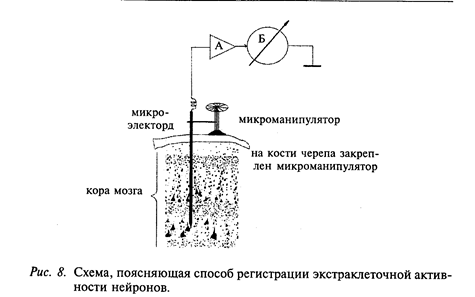 Для регистрации активности одиночных нейронов микроэлектрод закрепляют в специальном манипуляторе, который позволяет продвигать его в мозге животного с высокой точностью (рис. 8). В зависимости от задач исследования манипулятор может крепиться на черепе животного или отдельно. В первом случае это очень миниатюрные устройства, которые получили название микроманипуляторов. Характер регистрируемой биоэлектрической активности определяется диаметром кончика микроэлектрода. Например, при диаметре кончика микроэлектрода не более 5 мкм можно зарегистрировать потенциалы действия одиночных нейронов (в этих случаях кончик микроэлектрода должен приблизиться к исследуемому нейрону на расстояние около 100 мкм). При диаметре кончика микроэлектрода больше 10 мкм одновременно регистрируется активность десятков, а иногда сотен нейронов (мультиплай-активность).
