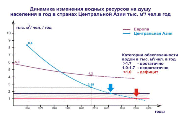 За последние сорок лет этот показатель снизился с 8,4 тыс.м3/в год на человека до 2,5 тыс.м3/год.чел. и имеет тенденцию к дальнейшему снижению. При нынешних темпах роста населения ЦА к 2030 году он достигнет критической величины – менее 1,7 тыс.м3/год.