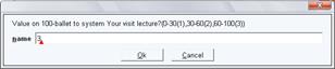 ask_name('Value on 100-ballet to system Your visit lecture?(0-30(1),30-60(2),60-100(3))', name, PL),