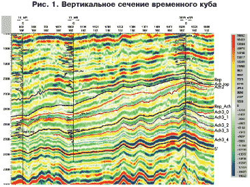 Для более качественного моделирования залежей нижней ачимовской пачки потребовалось ее расчленение на мелкие интервалы разреза. Достоверно сделать корреляцию по скважинам стало возможным, только используя данные 3D. По вертикальным и по горизонтальным сечениям сейсмического куба, по распределению сейсмофаций четко выделяются границы выклинивания и резкого уменьшения толщин отдельных пропластков, что позволило провести корреляцию дополнительных пяти горизонтов в пределах интервала Ач3 (рис. 1), в соответствии с которыми было выделено 5 пропластков в разрезах скважин.