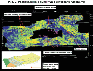 Анализ амплитуд показал, что в интервале Ач1(БС10) можно выделить и проследить в пространстве все классические составляющие клиноформы: шельфовую часть (ундаформа), склоновую часть и подножие шельфого склона (фондоформа). В дополнение к этому определяются кромка шельфа, склоновые потоки песчаного материала, области оползания и смятия глин на склоне под влиянием гравитации и тектонической активности и мутьевые потоки в глубоководной части клиноформы у подножия склона (рис. 2).