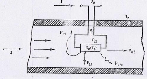 Рис. 3. Схематическое изображение процессов теплопередачи от самонагревающегося резистора в канале потока.