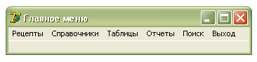 При вызове модуля gl_menu.db формируется меню, состоящее из пунктов: “Рецепты”, “Справочники”, “Таблицы”, “Отчеты”, “Поиск”, “Выход”.