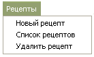 При выборе пункта меню “Рецепты” появляется подменю, состоящее из 3 подпунктов: “Новый рецепт”, “Список рецептов”, “Удалить рецепт”.