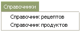 При выборе в меню пункта “Справочники” появятся подпункты: 1)Справочник по рецептам 2)Справочник по продуктам.