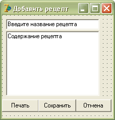 При нажатии на кнопку “Добавить” появится форма 7-Добавить рецепт, на которой находится поле для ввода названия рецепта и поле с содержанием рецепта, а также кнопки “Печать”, “Сохранить” и “Отмена”. Нужно будет вводить название добавляемого в справочник рецепта и его содержание. При нажатии на Печать будет распечатываться содержание рецепта. При нажатии на Сохранить рецепт добавляется в справочник. При нажатии на Отмена происходит возврат к форме 5-Справочник рецептов.