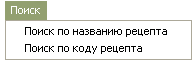 При выборе пункта меню “Поиск” появляется подменю, состоящее из 2 подпунктов: “Поиск по названию рецепта” и “Поиск по коду рецепта”.