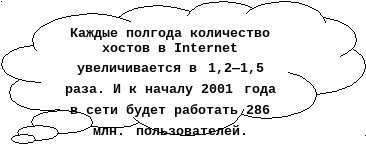 Анализ мировых тенденций развития сети Internet До начала 90-х годов сеть Internet развивалась достаточно медленно. Основными ее службами были электронная почта и межмашинный обмен файлами. Только с появлением и внедрением технологии гипертекстовых связей развитие сети Internet значительно ускорилось. Сеть стала доступна не только профессионалам в области сетевых технологий, но и представителям других профессий, студентам и даже детям. Если на конец 1981 года (а именно с этого времени начала вестись статистика по количеству хостов, работающих в прототипе Internet — сети ARPANET) в сети функционировало 213 хостов, то через 10 лет, на конец 1991 года, — 727 тыс. хостов. И это количество постоянно возрастает. На рис. 1 представлена информация по динамике роста хостов в Internet, которые анонсированы в соответствующих DNS. На конец января 1999 года в мире функционировало более 43,23 млн. хостов, было зарегистрировано более 1,3 млн. доменов второго уровня и более 14,9 млн. доменов третьего уровня . Каждые полгода количество хостов в Internet увеличивается в 1,2—1,5 раза. И эта тенденция характерна не только для экономически развитых, но и для стран восточной Европы и бывшего Советского Союза. В целом, объем Internet за последние 6 месяцев вырос на 50%, а за 1997 год — на 84%. Это больше, чем в 1996 году, когда рост составил 70%. С егодня Internet охватывает более 150 стран мира. По данным ведущей европейской консалтинговой компании Nue, услуги этой сети на конец 1998 года получали 153 млн. пользователей, в середине 1998 года их было 130 млн., в то время как на начало 1998 года количество пользователей сети оценивалось в 102 млн. (по данным компании IDC на конец 1997 года, без учета детей, услугами сети в мире пользовались 53 млн. человек). По прогнозам исследовательской компании Dataquest, до начала 2001 года в Internet будет работать 286 млн. пользователей. По данным Internet Industry Almanac, услугами Internet больше других пользуются в США (54,70% по отношению к общему количеству пользователей в мире), затем в Японии (7,97%), Великобритании (5,83%), Канаде (4,33%), Германии (4,07%) и Австралии (3,35%). На все остальные страны мира приходится только 19,75 % пользователей сети Internet. Аналогичные оценки приводятся и другими исследовательскими компаниями.