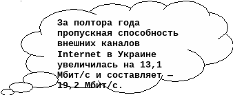 За последний год, несмотря на все трудности, связанные с финансовым кризисом, пропускная способность внешних каналов возрастала. На февраль 1999 года двенадцать украинских компаний имеют четырнадцать каналов связи с зарубежными провайдерами услуг Internet. К их числу относятся: Объединение «Укртелеком», г Киев (канал 2 Мбит/с в волоконно-оптической линии связи на UUNET, EBONE, Лондон, Великобритания, и канал 2 Мбит/с в волоконно-оптической линии связи на MCI, New York NAP, США); СП «Инфоком», г. Киев (спутниковый канал в 2 Мбит/с на Teleglobe, Канада); ООО «Lucky Net», г. Киев (спутниковый канал в 6 Мбит/с на VERIONET, США, спутниковый канал в 2 Мбит/с на ООО «Демос», Россия); СП «Global Ukraine» (спутниковый канал в 1 Мбит/с на Digex , New York NAP, США); Институт физики твердого тела (UARNET), г. Львов (наземный канал 384 Кбит/c/512 Кбит/cна NASK, NORDUnet, Стокгольм, Швеция); «Фарлеп», г. Одесса (спутниковый канал в 256 Кбит/cна UUNET, New York NAP, США) ; СП «PACO Links Int.», г. Одесса (спутниковый канал в 256 Кбит/cна Taide Networks, Норвегия); Телематика, г. Одесса (спутниковый канал в 128 Кбит/cна Octet, New York NAP, США); Монолит, г. Киев (канал в 64 Кбит/cна Demon, Великобритания); Представительство ООН в Украине, г. Киев (наземный канал в 64 Кбит/cна Unisource Internet Service, Нидерланды); Харьковский политехнический университет, г. Харьков (два наземных канала по 28,8 Кбит/cна Московский университет, Россия); Совам-телепорт, г. Киев (несколько наземных каналов по 2 Мбит/c на «Совам-телепорт», Россия). Напомним, что полтора года тому назад суммарная пропускная способность внешних каналов Internet составляла всего 6,1 Мбит/с. На сегодня пропускная способность внешних каналов Internet в Украине увеличилась на 13,1 Мбит/с и составляет 19,2 Мбит/с.