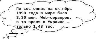Информационные ресурсы украинского сегмента Internet Теперь кратко остановимся на информационных ресурсах сети Internet и ее украинского сегмента. Сейчас все большее число компаний и отдельных пользователей понимают, какие широкие возможности по получению информации для служебных, профессиональных и бытовых потребностей предоставляет Internet. Internet не только обеспечивает доступ к огромным информационным ресурсам, но и значительно повышает производительность труда во многих секторах экономики и науки (простота поиска, оперативность получения информации и обмена данными, доступность экспертных оценок и др.). По некоторым данным, на Web-серверах в Internet сейчас располагается более 200 млн. страниц и каждые 4—6 месяцев этот объем удваивается. А что же в Украине на конец 1999 года? Постоянно прибегать к услугам Internet автор эти строк начал с середины 1995 года, однако систематически изучать особенности развития Internet — только с начала 1997 года. Так вот, на начало 1997 года в Украине было около 250 Web-серверов. В основном это были действительно Web-серверы. Предоставление клиентам возможности размещения их информации на Web-серверах компаний-провайдеров (так называемый хостинг - hosting) еще широко не практиковалось в тот момент в Украине. В середине 1997 года количество Web-серверов возросло до 750. Но это уже были не только «честные» Web-серверы. Значительное количество из них составляли так называемые виртуальные Web-серверы, когда на одном и том же хосте размещается как сервер хозяина хоста, так и сервера клиентов. Какая же информация была в то время на серверах? 43% серверов размещали рекламную информацию о коммерческих предприятиях и предоставляемых ими услугах. 13,5 % серверов знакомили с деятельностью провайдеров услуг Internet, их тарифами и услугами (кстати, на тот момент в украинском сегменте работало 102 провайдера). 24% серверов были сориентированы на широкий круг пользователей (предлагали, например, телефонные справочники, желтые страницы, культурологические и информационно-аналитические сведения и др.). На 6 % серверов находились электронные версии газет и журналов, а на 1,5 % серверов — данные о деятельности органов исполнительной и законодательной власти. Назначение же оставшихся 12 % серверов на момент обследования трудно было определить. По состоянию на март-апрель 1998 года в Украине уже было 930 Web-серверов и виртуальных Web-серверов, на июль 1998 года — 1084, а на февраль 1999 года — 1480. Следует отметить, что за это время не только увеличилось количество серверов, но и значительно возросло их информационное наполнение и улучшилось качество подачи информации. В этом сегменте рынка появился ряд компаний, которые профессионально занялись информационным наполнением серверов, платным предоставлением доступа к нему и размещением рекламы на товары и услуги. Какова же статистика по информационному содержанию Web-серверов на сегодня? Н а февраль 1999 года на Web-серверах находились следующие ресурсы: информация о предприятиях, банках и биржах — на 42 % серверов, сведения для широкого круга пользователей — на 29,5 %, информация о провайдерах услуг Internet и предоставляемых ими услугах — на 10 %, электронные версии газет и журналов — на 8,5 %, информация о научно-исследовательских институтах и учебных заведениях (около 6 %) и о деятельности органов исполнительной власти — на 3 % серверов. Появ