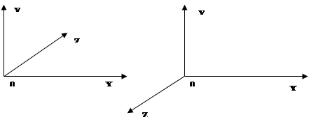 Таким чином, положення в просторі точки описується її координатами, що записується як . Взаємне розташування осей в ортогональній системі координат у тривимірному просторі може бути двох видів. Проведемо вісь з ліва на право, а вісь знизу вгору, як показано на Рис. 1.2.
