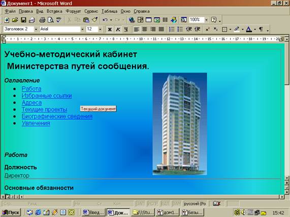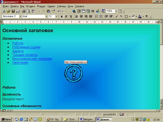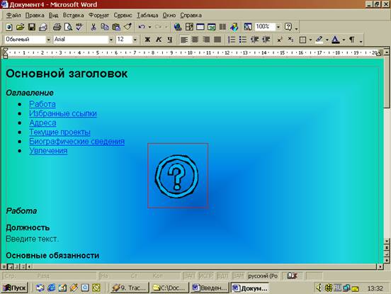 Там предложено несколько вариантов разметки страницы (личная основная страница, оглавление, обзор, регистрационная форма и т. п.), и стилей цветового оформления, из которых всегда можно выбрать подходящий. Эти шаблоны могут многому научить пользователя. Microsoft Word позволяет открывать готовые HTML-документы. Так же когда сохраняют документы Интернет c помощью средства просмотра ресурсов (Microsoft Internet Explorer), надо выбирать формат HTML. Это поможет сохранить форматирование и использовать его в своей дальнейшей работе. Лучший инструмент редактирования этих документов на рабочем месте - Microsoft Word 97.