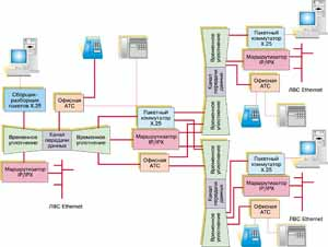 При использовании метода временного уплотнения (Time Divsion Multiplexing - TDM) различным каналам передачи данных предоставляются различные интервалы времени уплотненного канала. Мультиплексоры смешивают поток данных и оцифрованный голос с одной стороны канала связи, и разделяют их с противоположной (см. рис.1). При этом коммутацию телефонных соединений производят обычные АТС, причем в этом случае применяются относительно высокоскоростные методы оцифровки аналогового телефонного сигнала, а потоки данных обрабатываются также традиционными средствами - коммутаторами Х.25 и маршрутизаторами IP/IPX. Основной недостаток этого метода заключается в цикличности распределения интервалов времени между каналами, т. е. независимости выделяемого каждому каналу интервала времени от наличия либо отсутствия необходимости передавать информацию. В результате, при неравномерном трафике эффективность использования ресурса канала оказывается невысокой.