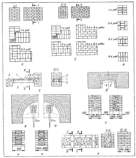 а — цепная перевязка; б — многорядная перевязка; в — четырехрядная перевязка; г — рядовая перемычка; д — клинчатая перемычка; е — арочная перемычка из фасонного кирпича; ж — то же, с клиновидными швами; з — кирпично-бетонная кладка; и — кирпично-блочвая кладка; к — кладка с вутообразными растворными диафрагмами; л — колодцевая кладка; 1 — щит опалубки; 2 — кружала из труб и досок: 3 — полосовая или круглая сталь, 4 — клинья.