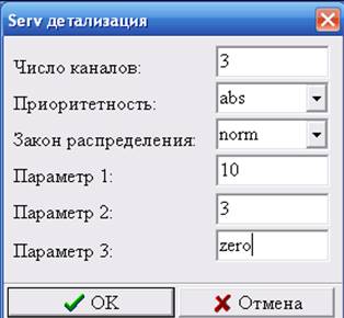В очередях заданий необходимо установить флаг учета приоритета транзактов (значение "prty"), в параметрах серверов так же нужно задать флаг учитывания приоритетов транзактов (значение "abs"), а также установиться закон распределения и время обработки в соответствии с рисунком 5.