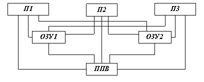 На рис. 1 представлена упрощенная схема МПВК, содержащая три процессора, два модуля ОЗУ и одну подсистему ввода – вывода информации (ПВВ). Даже для такого простого варианта схема оказывается достаточно сложной, так как в МПВК должен быть обеспечен доступ любого процессора и любого канала ввода – вывода к любой ячейке ОЗУ, любого процессора к любому каналу и периферийному устройству. Если представить теперь, что процессоров существенно больше, что ОЗУ по соображениям надежности и удобства наращивания емкости выполнено в виде нескольких модулей, а подсистема ввода – вывода включает в себе несколько каналов и большое число периферийных устройств, то становится ясным, насколько сложна топология МПВК. Если же учесть то обстоятельство, что для работы ОС аппаратные средства должны обеспечивать работу с переменными логическими адресами ОЗУ, периферийных устройств и каналов ввода – вывода, защиту памяти от взаимного влияния различных программ и возможность запуска одним процессором другого, сложность аппаратной реализации МПВК становится ясной в полной мере.