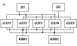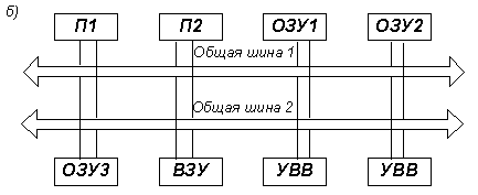 Вместе с тем комплексы с общей шиной не лишены определенных недостатков. Первый – невысокое быстродействие, так как одновременный обмен информацией возможен между двумя устройствами, не более. По этой причине в комплексах с общей шиной число процессоров не превосходит двух-четырех. Этот недостаток может быть несколько компенсирован путем использования общей шины с высоким быстродействием, большим, чем быстродействие входящих в комплекс устройств. Однако этот путь приводит к усложнению и удорожанию комплекса. Второй недостаток МПВК с общей шиной заключается в относительно низкой надежности системы из-за наличия общего элемента – шины. Надо иметь в виду, что надежность общей шины определяется не только надежностью проводов и кабелей (их собственная надежность достаточно высока), но и надежностью всех соединений, входных и выходных цепей устройства. Отказ хотя бы одного из элементов приводит к отказу всего комплекса. Этот недостаток можно компенсировать за счет введения резервной шины (рис. 2.7, б).