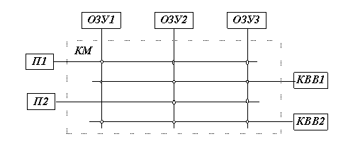 ). Коммутационная матрица (КМ) позволяет связывать друг с другом любую пару устройств, причем таких пар может быть сколько угодно: связи не зависят друг от друга.